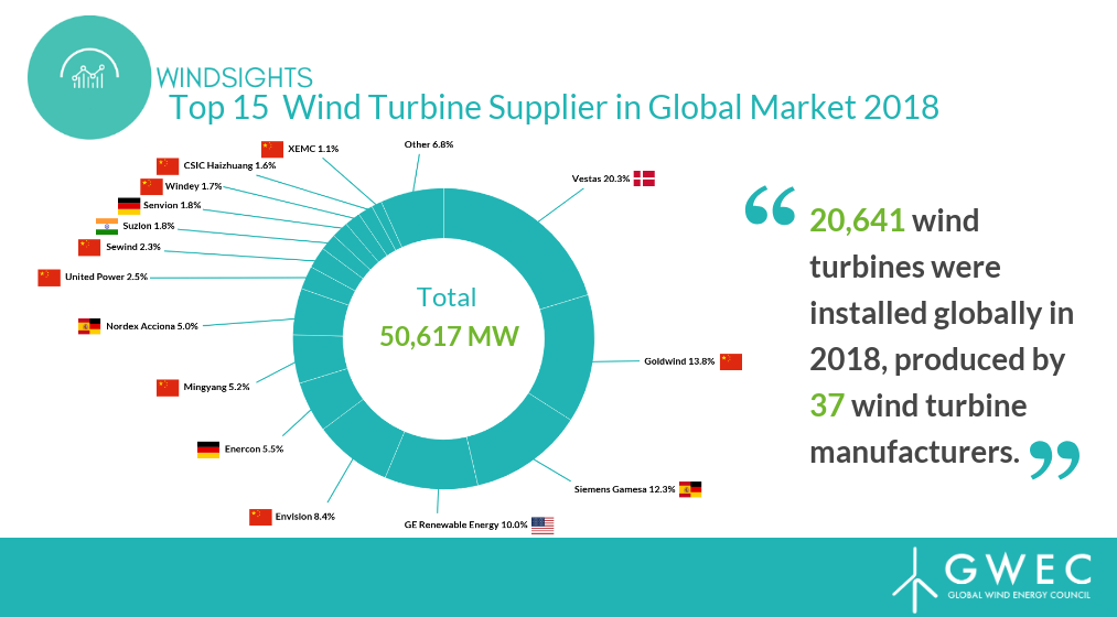 雖然維斯塔斯,西門子歌美颯和通用電氣可再生能源等知名公司占據(jù)了前五位,但GWEC的報(bào)告顯示,2018年前15大風(fēng)電機(jī)制造商中有一半以上位于中國。