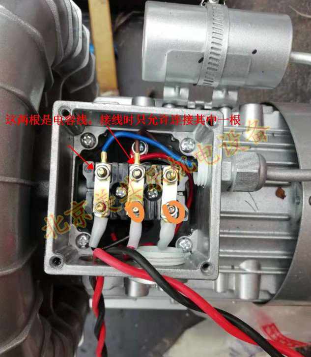 如圖所示,電線是連接在右方兩根柱子上的,接電源線的時候只能連接到其中一根,另一根電源線接到最右邊就可以了,220v旋渦風機不存在反轉情況,最后,別忘了地線也連接哦。