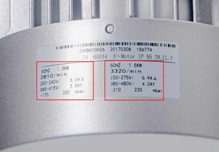 通常國內的鼓風機標注得為50HZ和60HZ兩種,這是因為,電機部分采用的國標寬電壓的配置。而國外的有的時候標準的為三種。